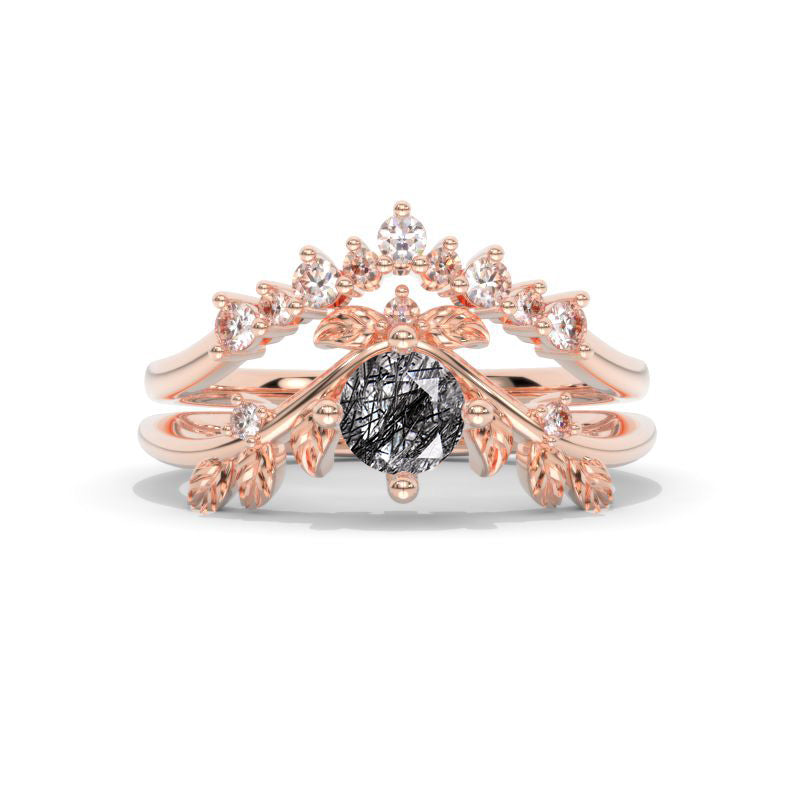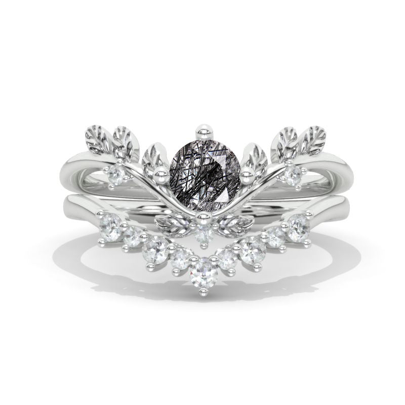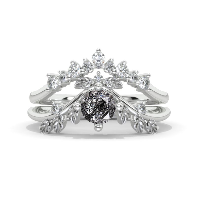 Natural Rutilated Quartz Floral Halo 14K White Gold Engagement Ring Set