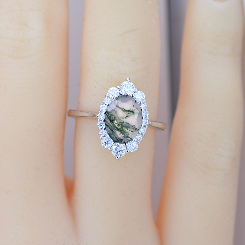 Oval 9x7 Moss Agate Halo Engagement Ring, Promise Ring For Her, Moss A - Giliarto