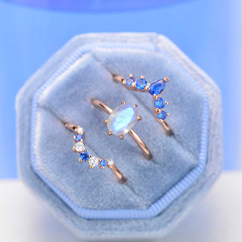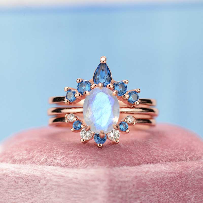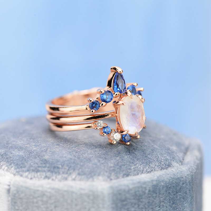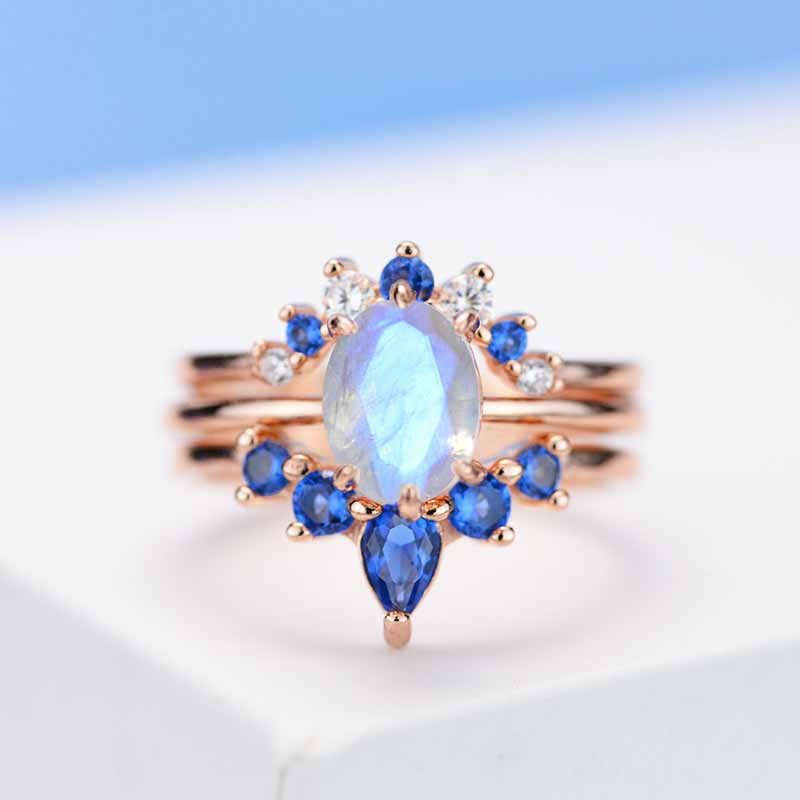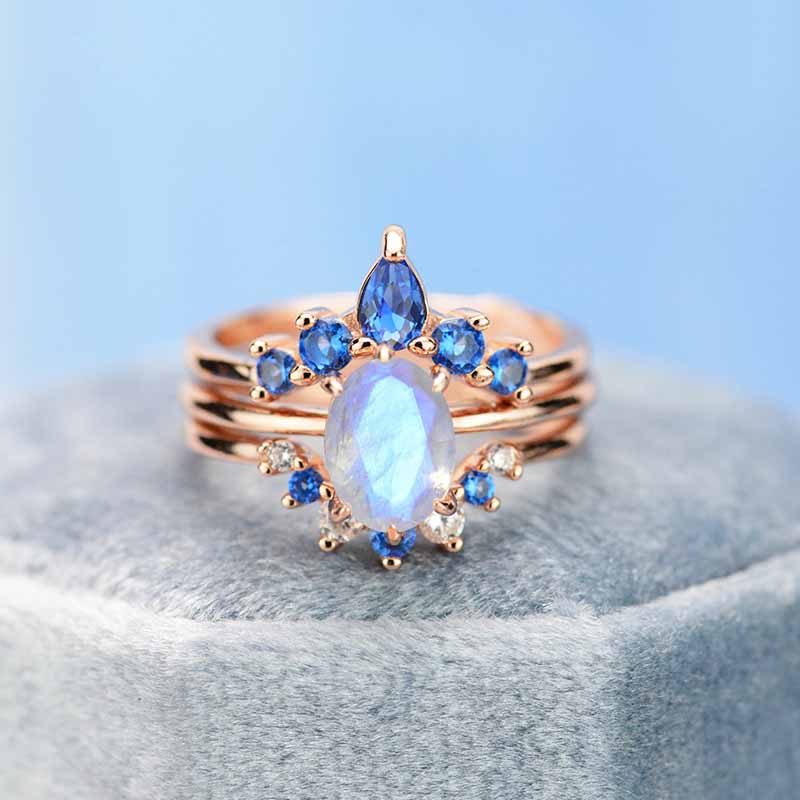 Vintage Design Genuine 3 Carat Oval Cut Moonstone Ring- Three Ring Set.