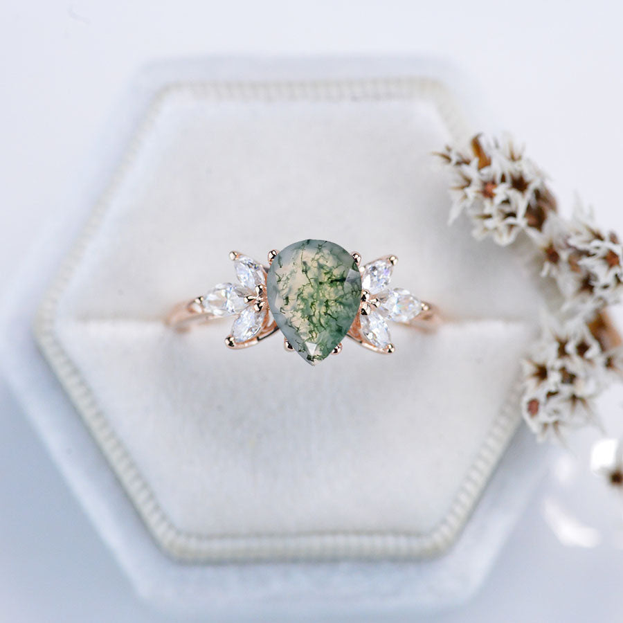 The default design option features 9x7mm Pear Cut Genuine Moss Agate Stone, VG-Cut, Ex-Polish, VG-Symmetry Set with D-Colorless Accent Moissanite Stones in 14K Rose Gold Engagement Ring.
