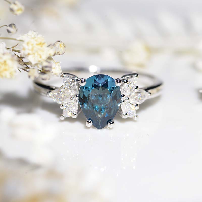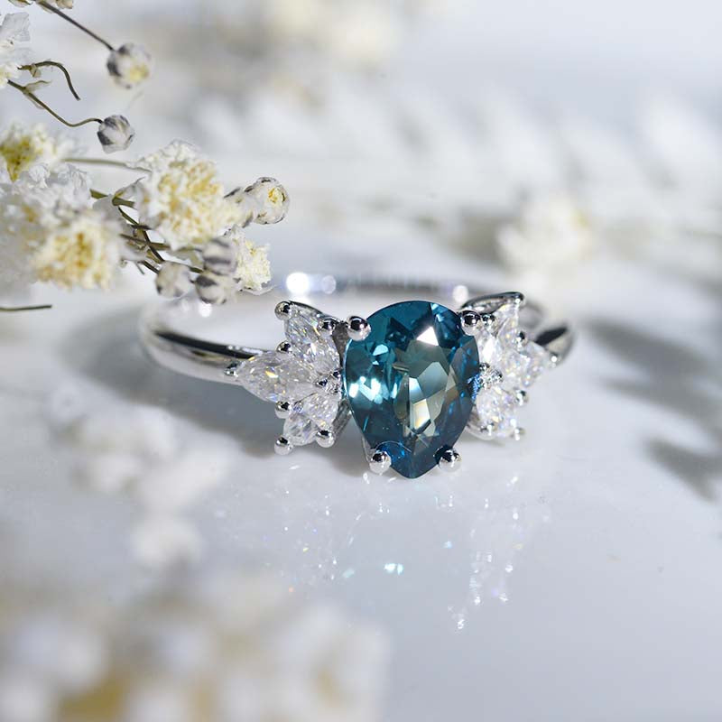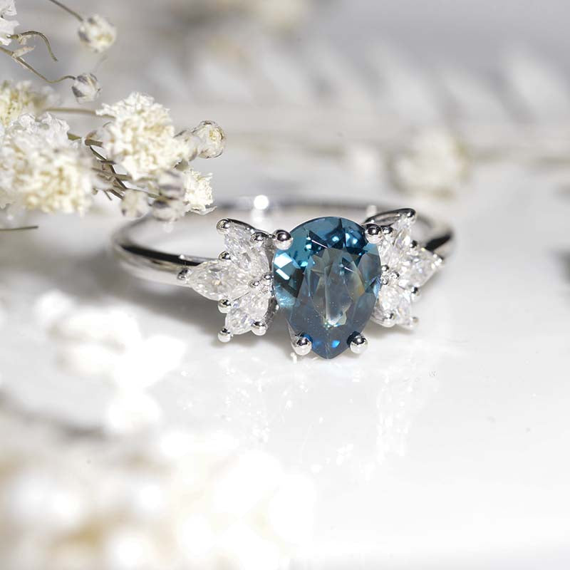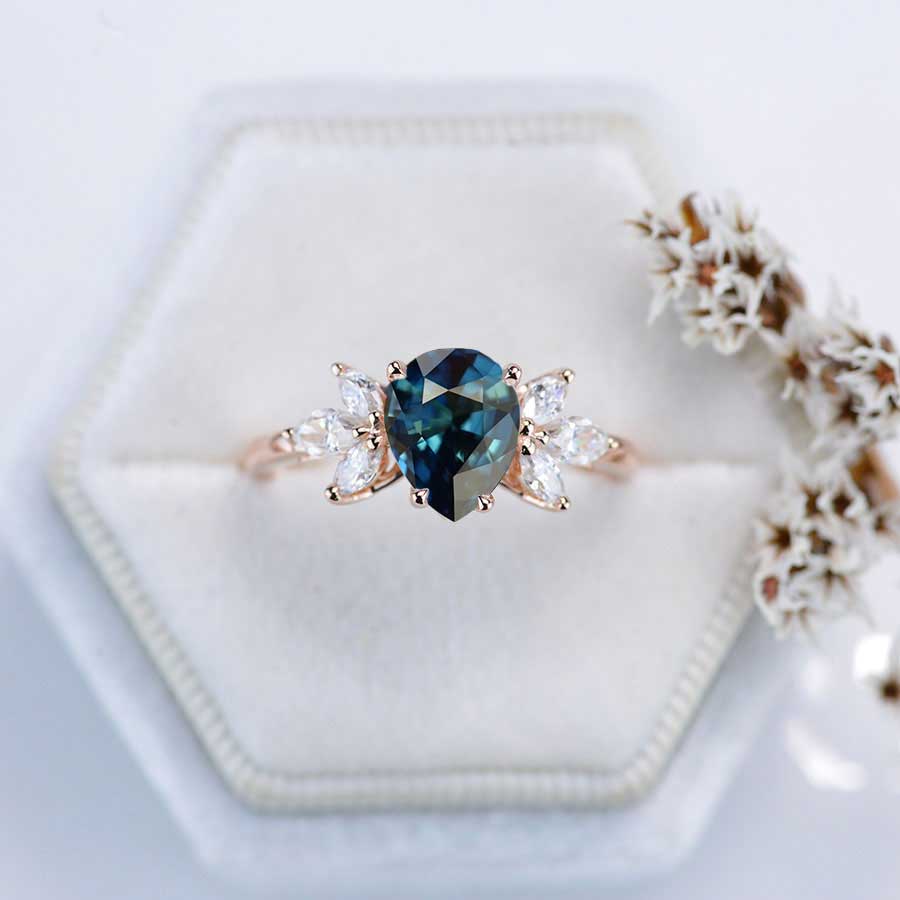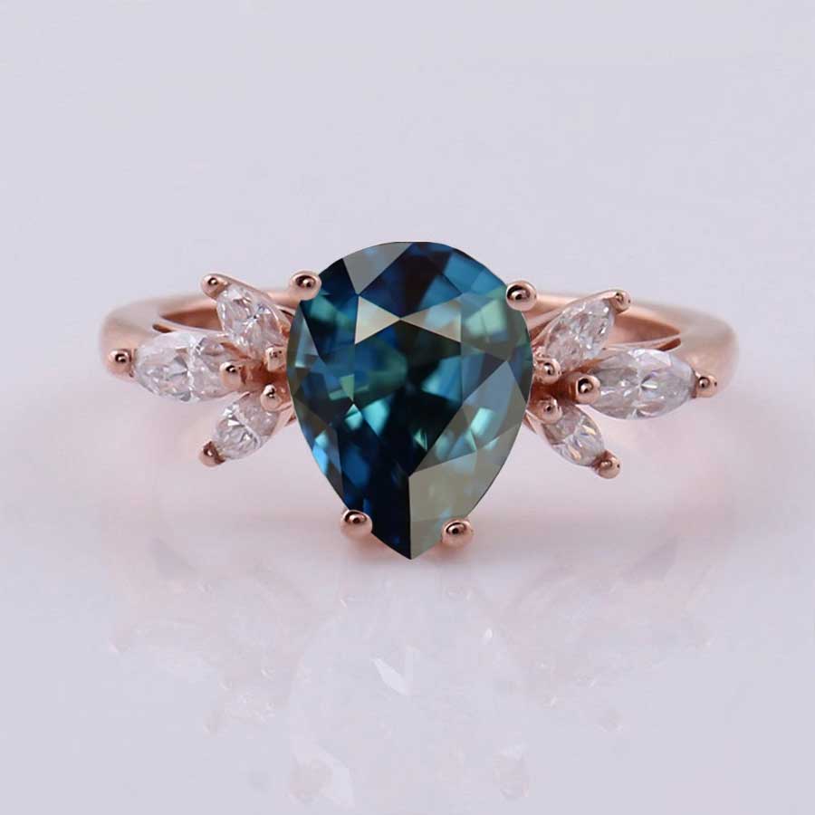 The default design option features 9x7mm Pear Cut Ethically Lab-Grown Teal Sapphire Stone, VG-Cut, Ex-Polish, VG-Symmetry Set with D-Colorless Accent Moissanite StonesĀ in 14K Rose Gold Engagement Ring.Ā