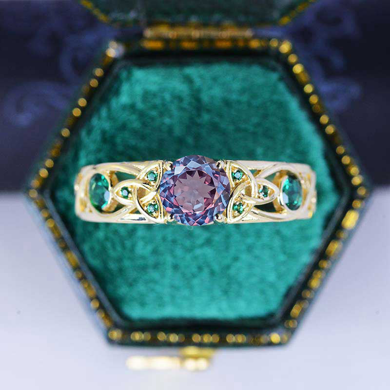 On the image featured Celtic Round Portuguese Cut Ethically Lab-Grown Alexandrite 6mm,  VG-Symmetry  with 10-0.25 CTW  Emerald accent stones 14K Yellow Gold Ring.