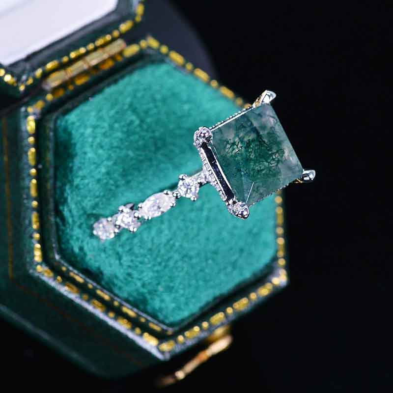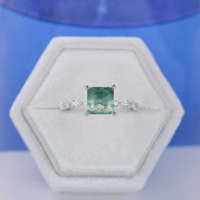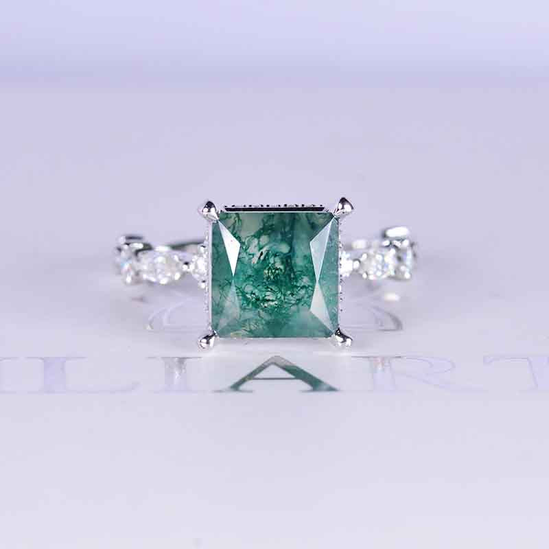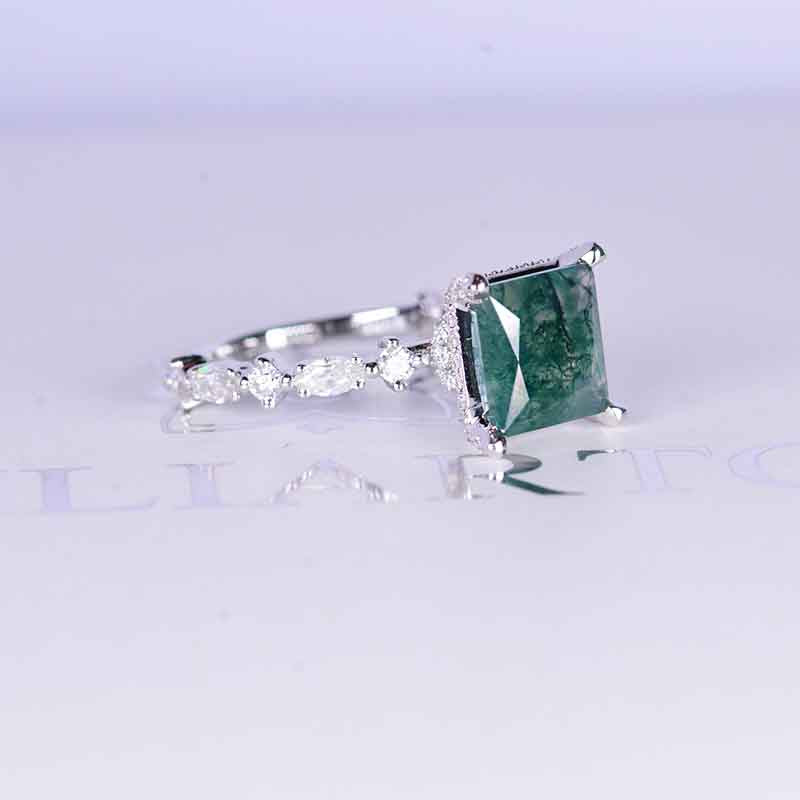 Princess Cut Genuine Moss Agate White Gold Giliarto Engagement Ring Mo