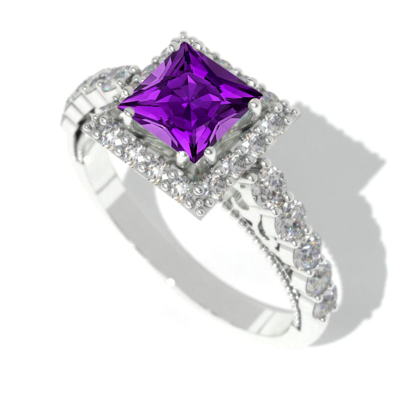 The default design option features 1.5 Carat Princess Cut 6x6 mm Genuine Natural Amethyst- AAAA Grade Stone