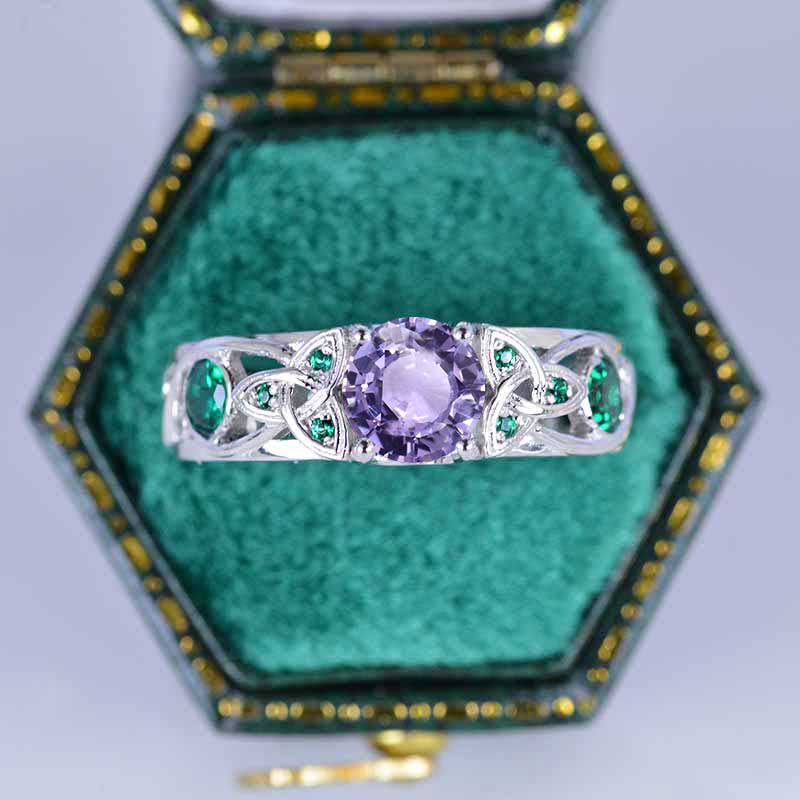 On the image featured Celtic Round Ethically LAB-Grown Purple Sapphire 6mm VVS1-Clarity,  VG-Symmetry  with 10-0.25 CTW  Emerald accent stones 14K White Gold Ring. Please remember that you can customize any design with your choice of metals and stones.