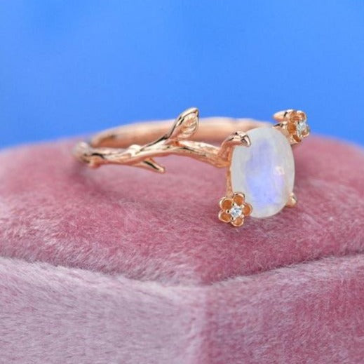 Rose Gold Plated Silver Dainty Natural Moonstone Leaf Ring, 2ct Oval Moonstone Twig Ring, Rose Gold Ring Unique Curved Vintage Floral Ring