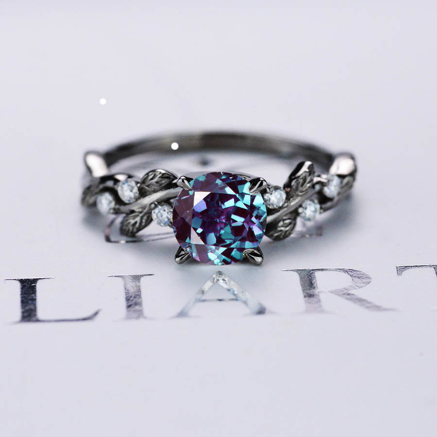 Round Brilliant Cut Alexandrite Floral Black Gold Engagement Ring