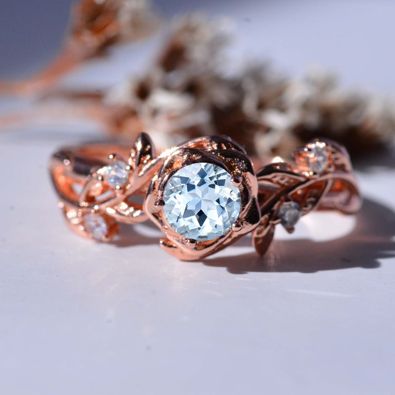 Round Brilliant Cut Genuine Natural Aquamarine Floral Rose Gold Engage - Giliarto