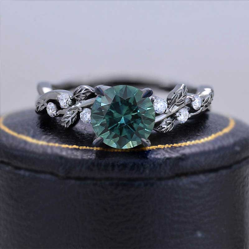 Round Brilliant Cut Teal Sapphire Floral Black Gold Engagement Ring