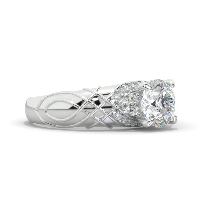 The default design option features 7mm Round Giliarto Moissanite Center Stone: D-Colorless, VVS1-Clarity and 0.3 CTW D-Colorless, VVS1-Clarity, VG-Cut, Ex-Polish, VG-Symmetry Accent Stones (Colorless)