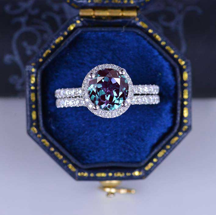 Round Halo Alexandrite ring set, Alexandrite Halo ring, Alexandrite ri - Giliarto