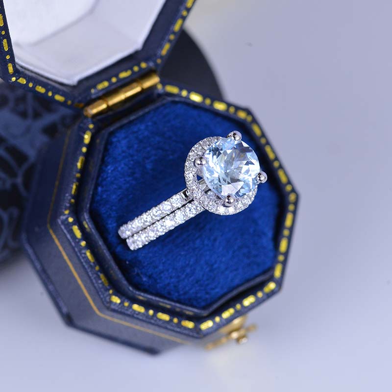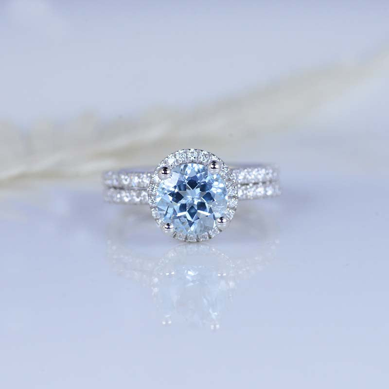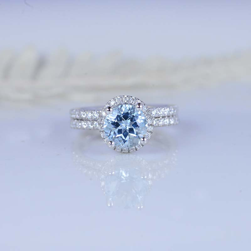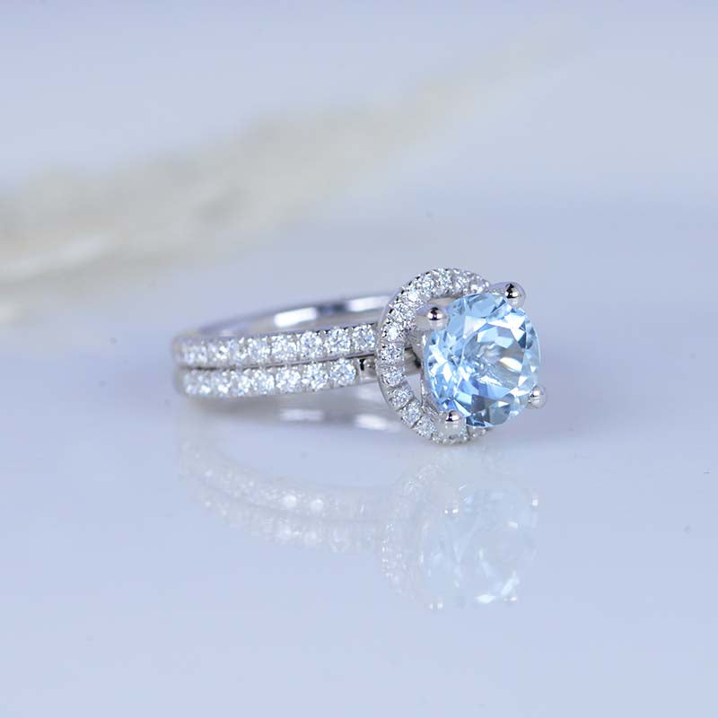Round Halo Aquamarine ring set, Aquamarine Halo ring, natural aquamari - Giliarto