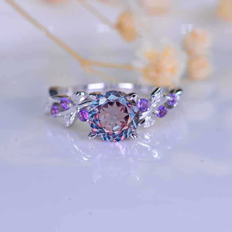Round Portuguese Cut Alexandrite Floral White Gold Engagement Ring