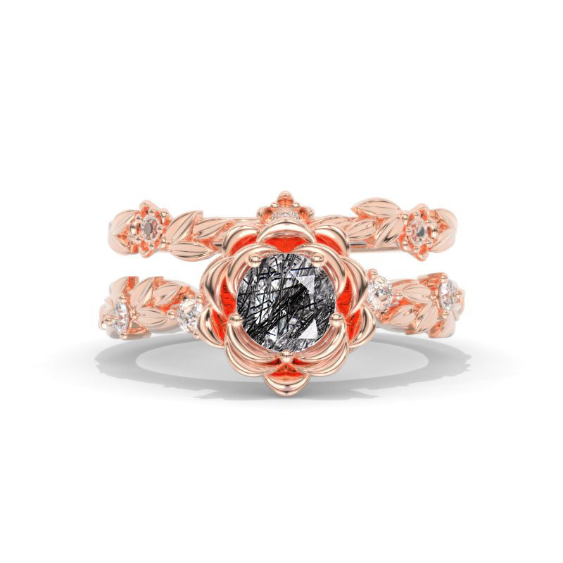 Round Quartz Round Floral Halo 14K White Gold Floral Fairy Tail Engagement Ring Set