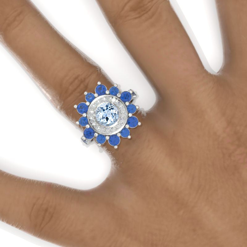 Sapphire Double Halo Genuine Natural Aquamarine Cluster Ring