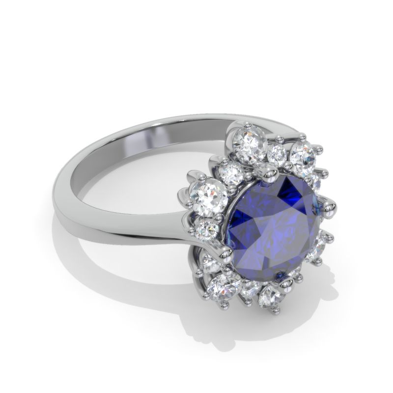 Royal Blue  - Color, VVS1-Clarity, VG-Cut, Ex-Polish, VG-Symmetry with Moissanite D-Colorless Halo Stones  in 14K White Gold Engagement Ring.