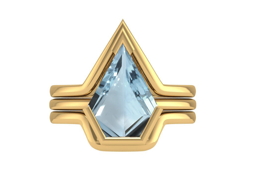 Shield Genuine Natural Aquamarine 14K Gold Yellow 4 Carat Kite Genuine Natural Aquamarine Unique Engagement Ring, Plain Eternity Ring Set. Three Rings Set