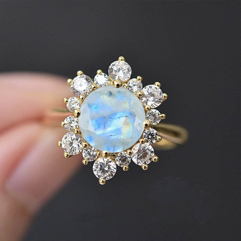 Snowflake Genuine Moonstone Ring/2.0ct Round Cut Genuine Moonstone Hal - Giliarto
