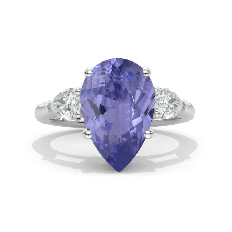 The default design option features 5,5 Carat 14x9mm Pear Cut Ethical Lab-Grown Lavender Purple Sapphire Center Stone VVS1-Clarity, VG-Cut, Ex-Polish, VG-Symmetry with D-Colorless Moissanite Accent Stones