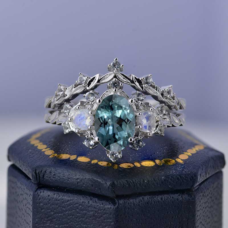 Teal Sapphire Ring Set, Oval Cut Teal Sapphire Floral Twig Ring Set, W - Giliarto