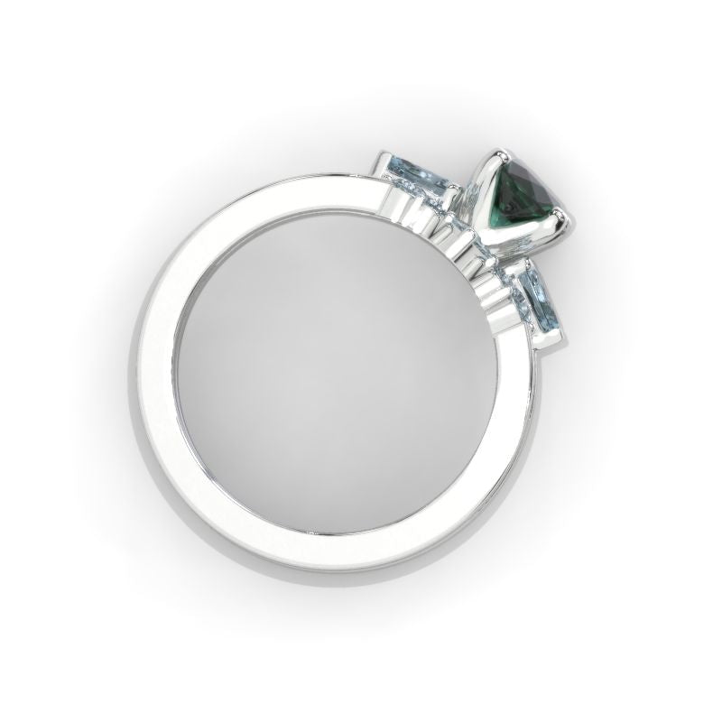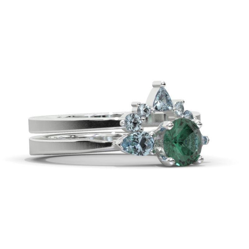 The default design option features Ethically Lab-Grown Teal Sapphire , VG-Cut, Ex-Polish, VG-Symmetry Center Stones set with Genuine AAAA Aquamarine  Accent Stones