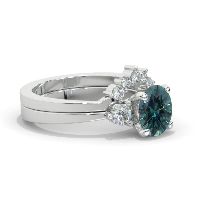 The default design option features Genuine Natural Teal Sapphire , VG-Cut, Ex-Polish, VG-Symmetry Center Stone (Colorless)