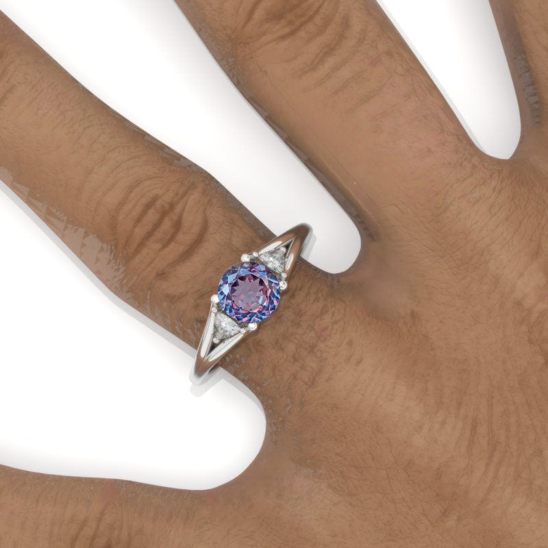 6mm Round Three Stone Portuguese Cut Ethically LAB-Grown Alexandrite Center Stones Shape: Round, VG-Symmetry with two 3x3mm trillion side stones in 14K White  Gold.