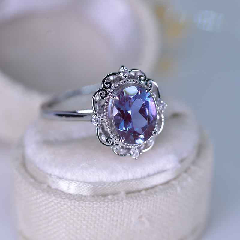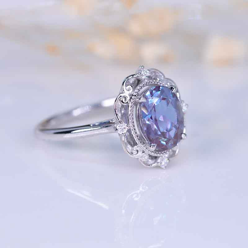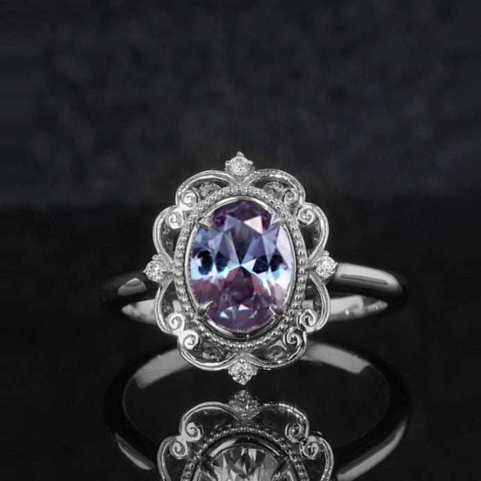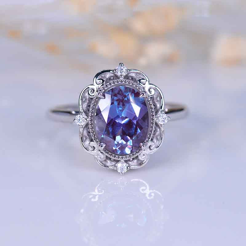 The default design option features 9x7 MM Oval Lab-Grown Alexandrite Stones  VVS1 - Clarity, VG-Cut, Ex-Polish, VG-Symmetry set with Moissanite Accents