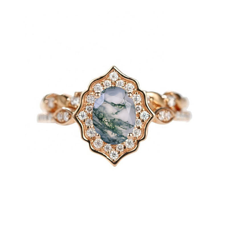 Vintage Oval Genuine Moss Agate Engagement Flower Ring