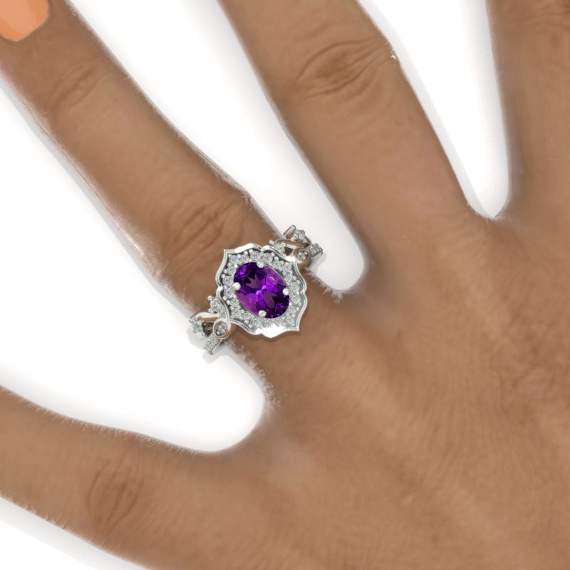 Vintage Oval Shaped Natural Amethyst Engagement Ring 14K White Gold Fl - Giliarto