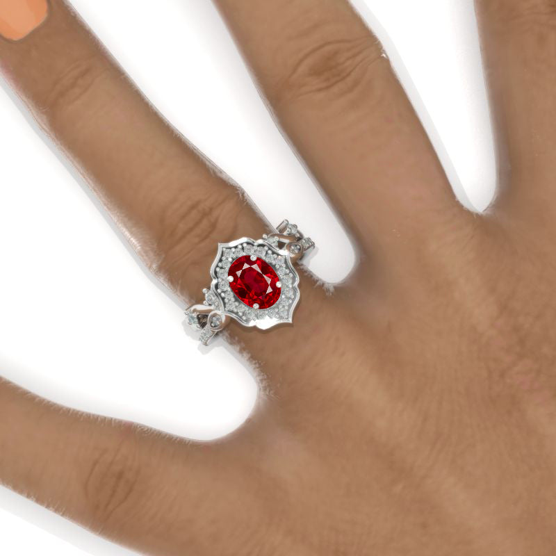 Vintage Oval Shaped Ruby Engagement Ring 14K White Gold Flower Rose Go - Giliarto