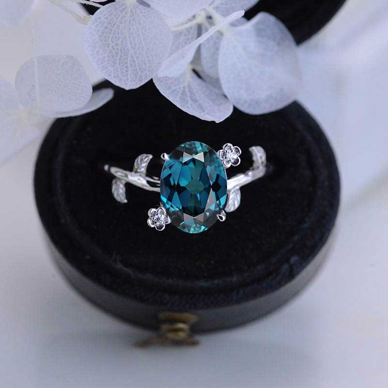 White Gold Dainty Cornflower Sapphire Leaf Ring, 2ct Oval Cornflower S - Giliarto