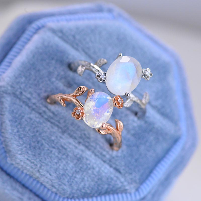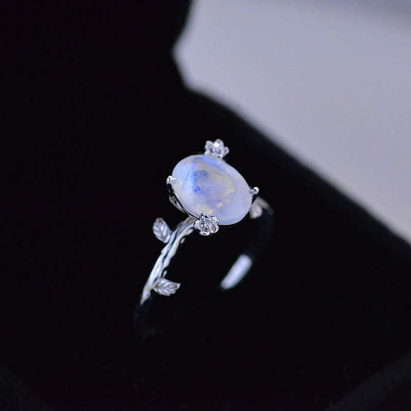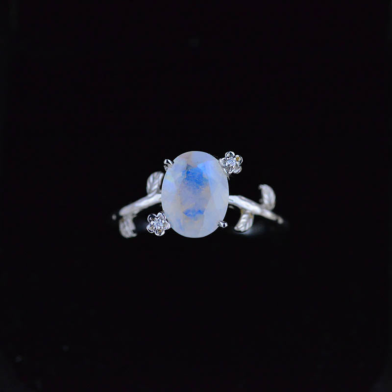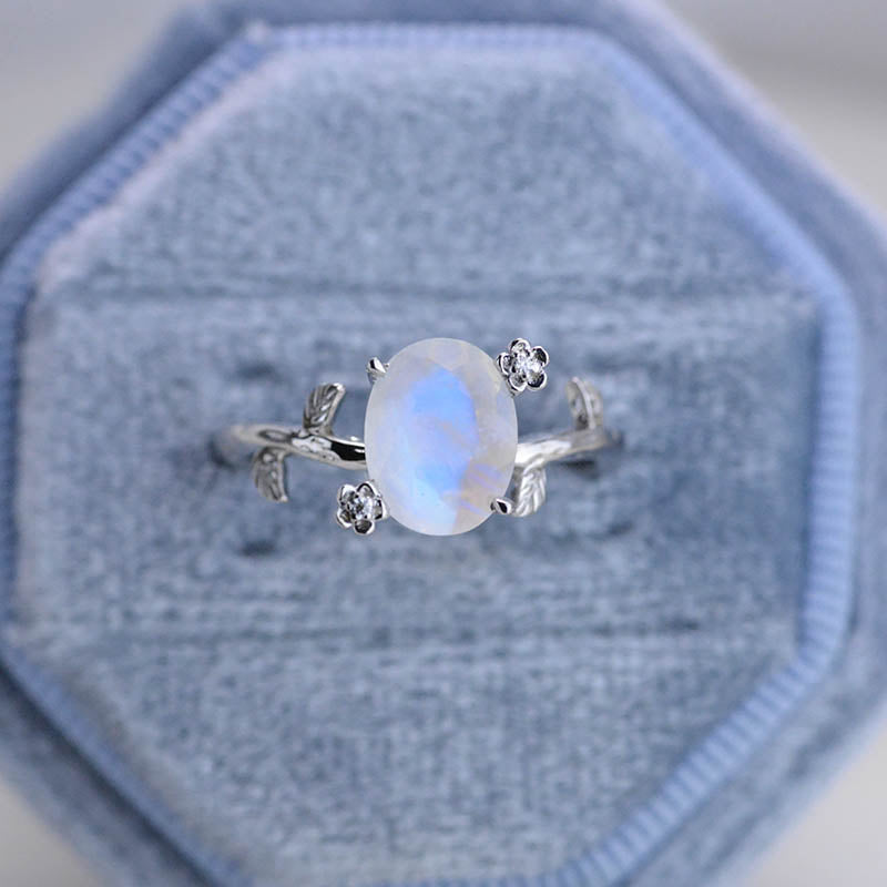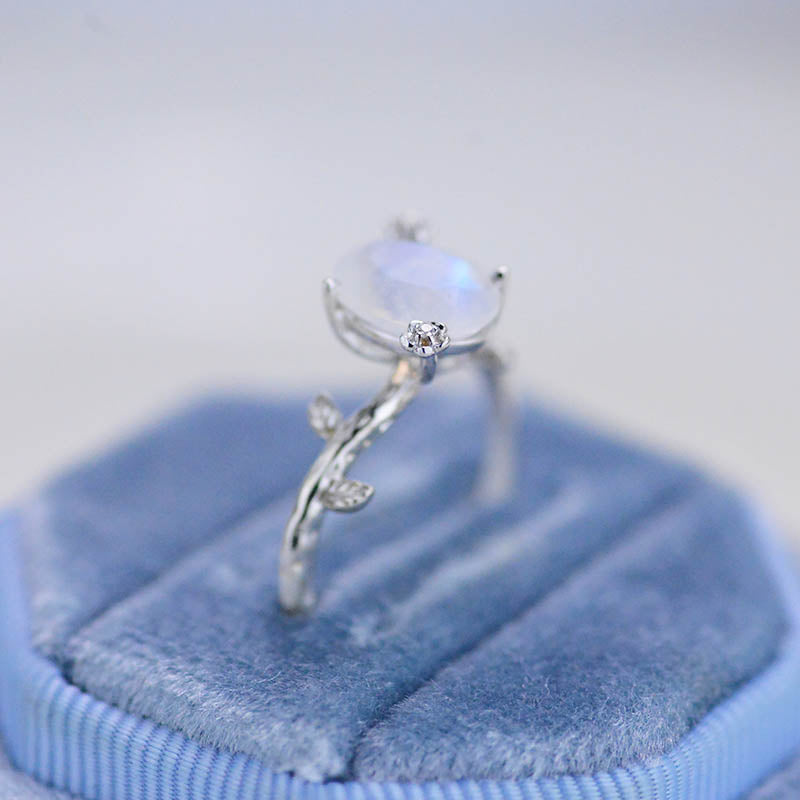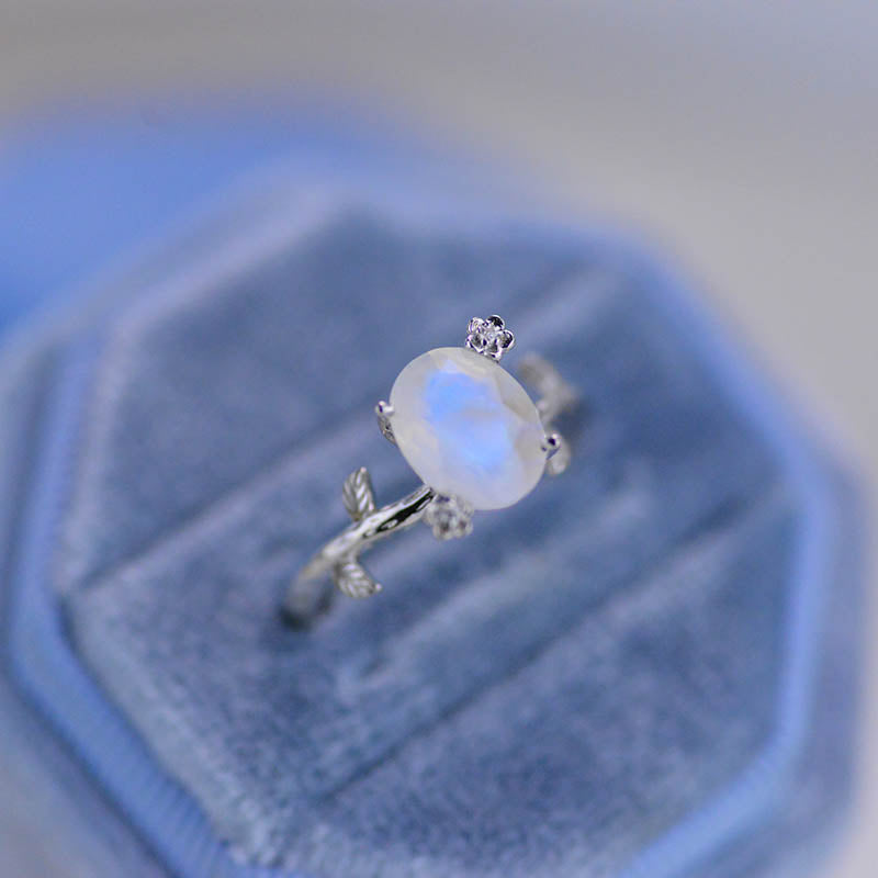White Gold Dainty Natural Moonstone Leaf Ring, 2ct Oval Moonstone Twig - Giliarto
