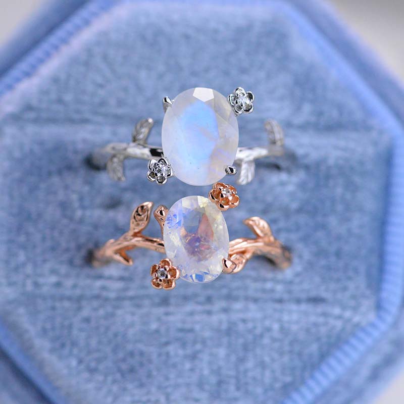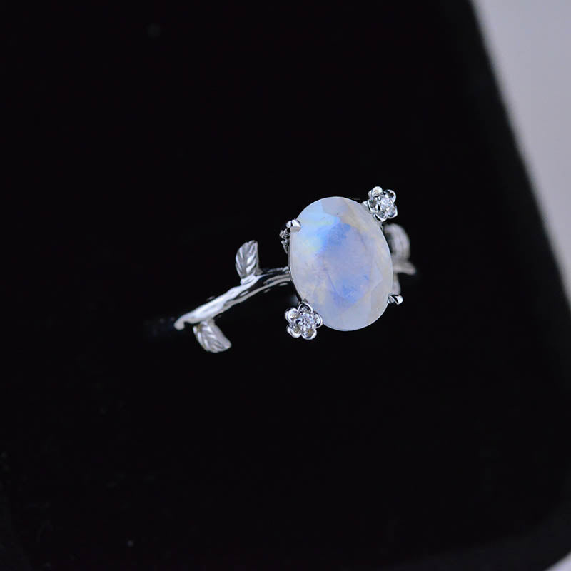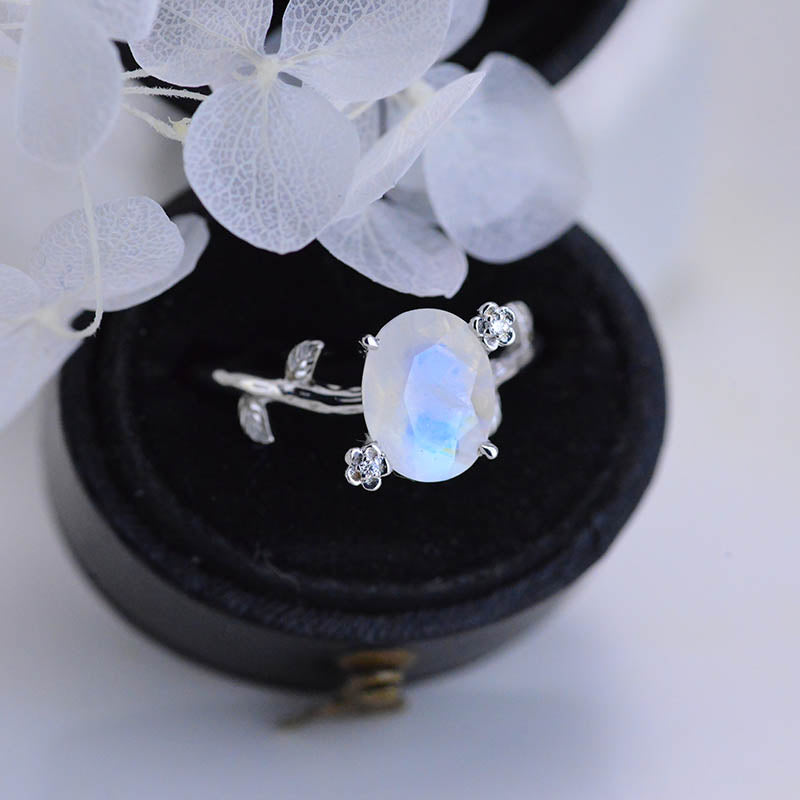 White Gold Dainty Natural Moonstone Leaf Ring, 3 Carat Oval Moonstone Twig Ring