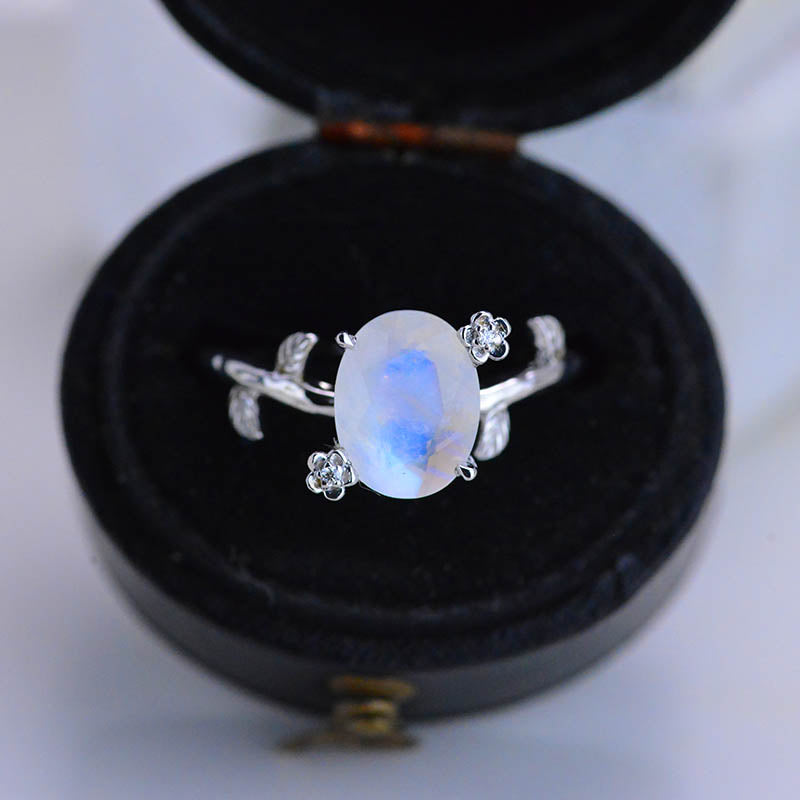 White Gold Dainty Natural Moonstone Leaf Ring, 3 Carat Oval Moonstone - Giliarto