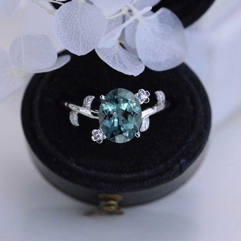White Gold Dainty Teal Sapphire Leaf Ring, 2ct Oval Teal Sapphire Twig - Giliarto
