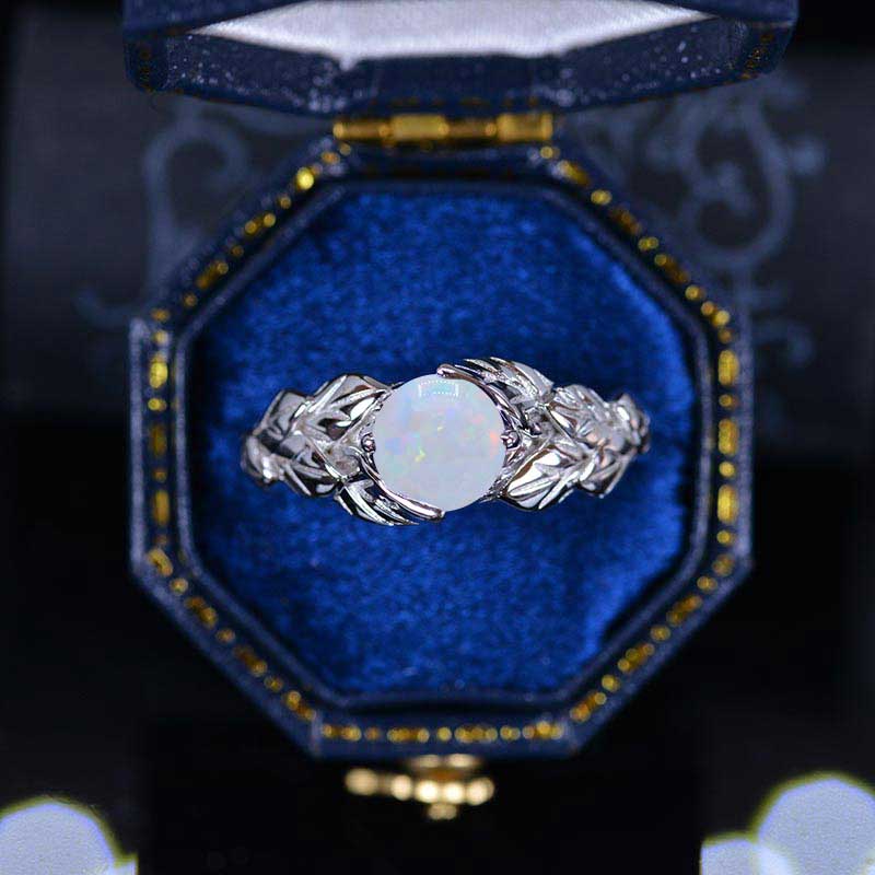 White Opal Leaf Engagement Ring 14K White Gold
