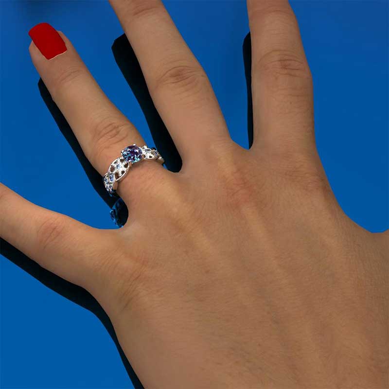 On the image you are looking at Ethically Lab-Grown Alexandrite ( Round 6.5 mm)   Ring with 10- 0.16 CTW  Sapphire accent stones and 14K White Gold Ring.